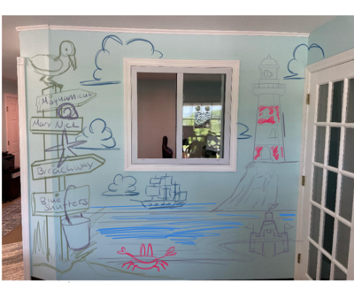 I like to kick things off digitally. Using my tablet, I’ll hand-sketch a custom mockup of your mural so you can see how it looks on your actual wall before we commit to paint. You’ll be able to explore color options, styles, and layouts to make sure the design feels just right. This is the first paid stage of the project.