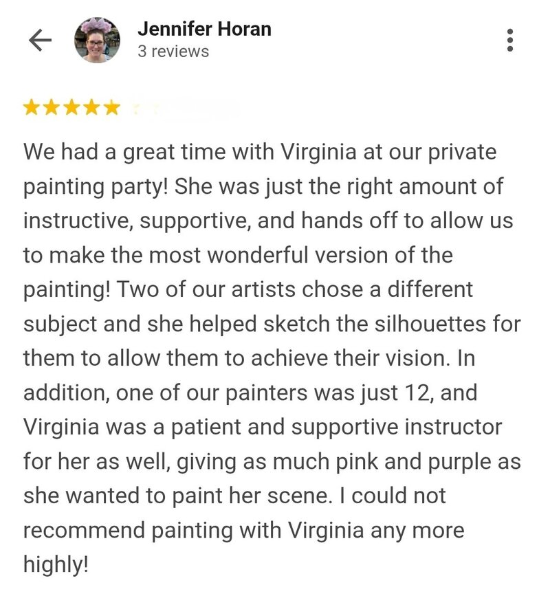 We had a really good time chatting while learning to paint. She really supports creativity and assists in making our own vision of the paint night's theme come true!"